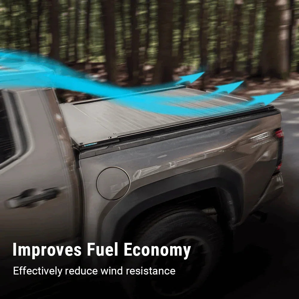 Our truck bed cover is constructed with durable aluminum slats that are powder-coated with textured black finish. This combination of materials provides excellent protection against rain, snow, salt, leaves, and other elements that may cause damage to your truck bed.